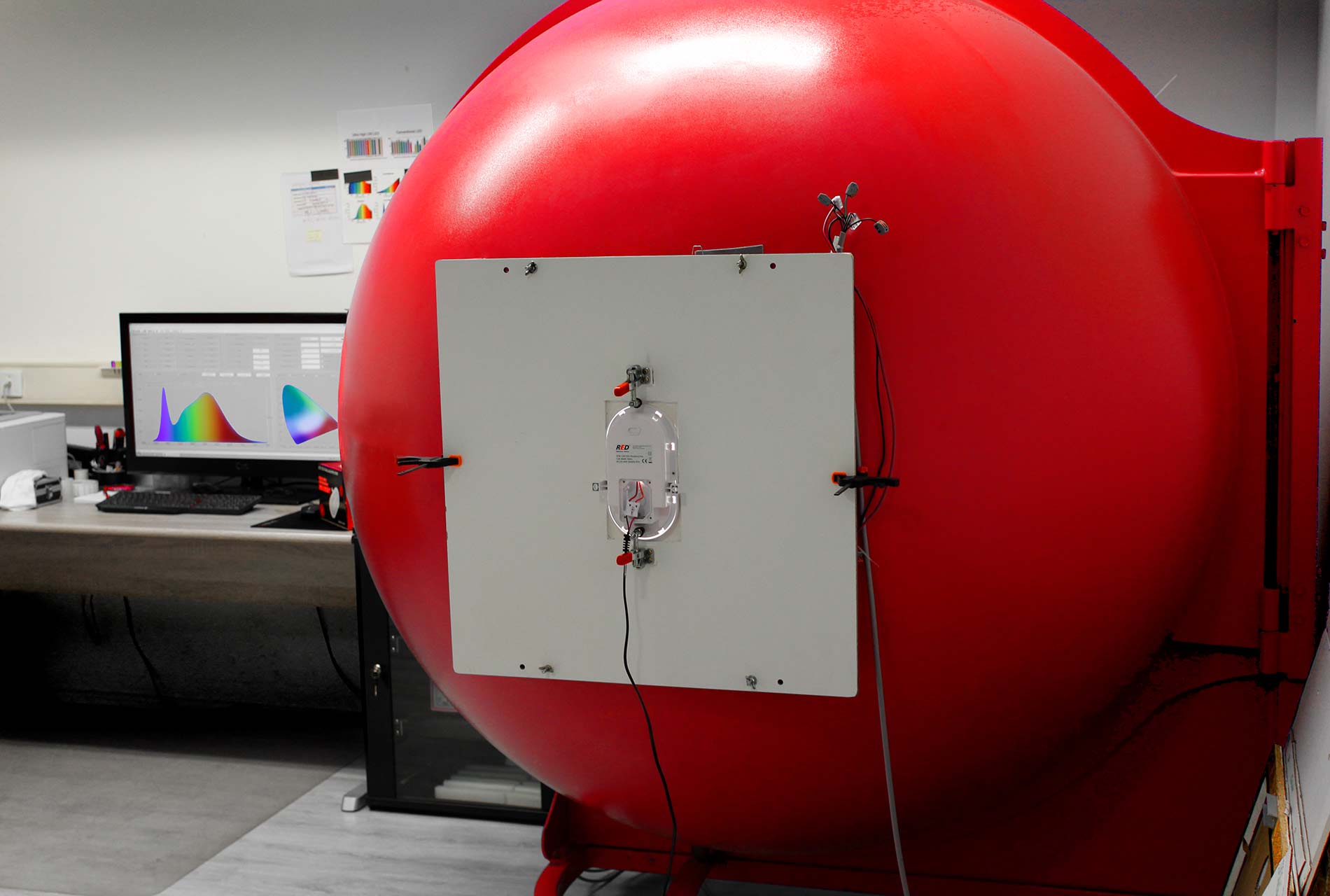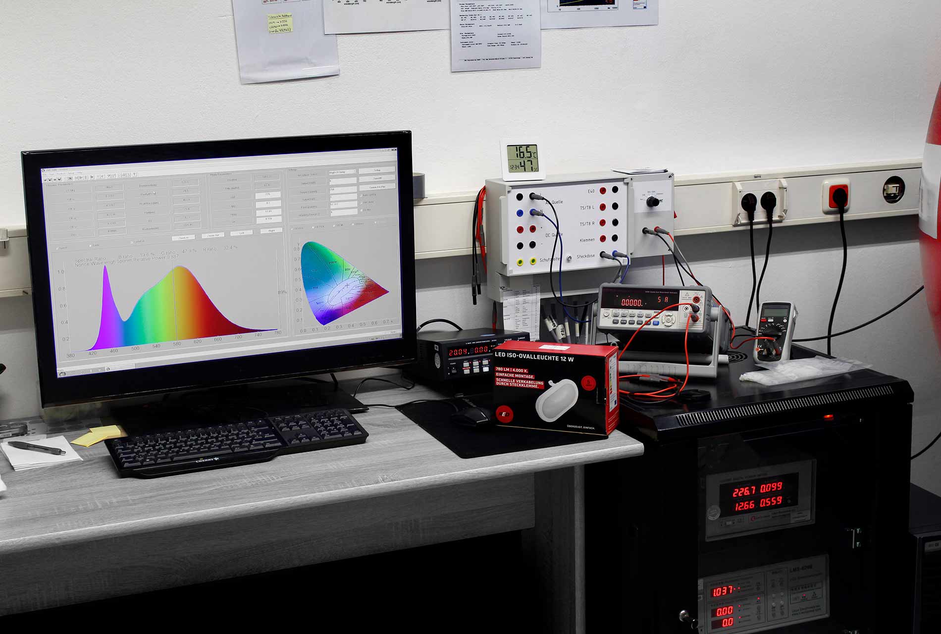 Mit einer photometrischen Vermessung in der Ulbrichtkugel ermitteln wir, wie die tatsächlichen Werte für Farbort, Farbwiedergabe, Farbtemperatur, Lichtstrom und Effizienz liegen. Abschließend werden Untersuchungen zu Störfestigkeit und Störaussendung vorgenommen, die sicherstellen, dass weder vom Produkt ungewollte Beeinflussungen